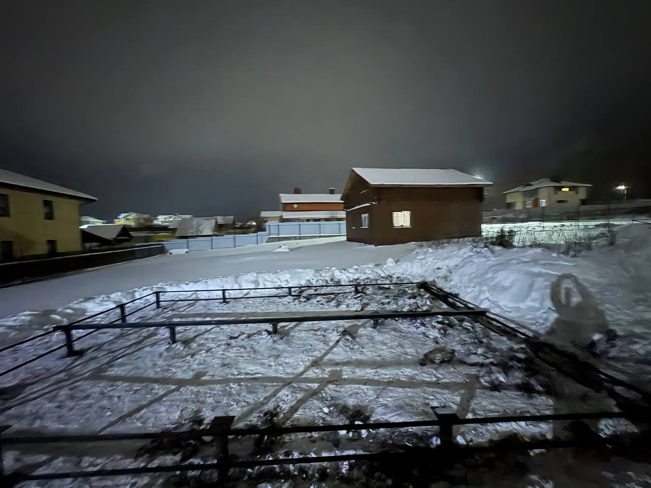Процесс погружения винтовых свай проходил под строгим контролем уровня. Каждая свая завинчивалась на глубину ниже уровня промерзания почвы, что гарантирует стабильность фундамента в любое время года. После того как все опоры были установлены, мы произвели их обрезку по единому горизонтальному уровню и заполнили полости цементно песчаной смесью для предотвращения коррозии изнутри. Завершающим этапом монтажа стала приварка оголовков. Несмотря на то что рабочий день затянулся и финальные кадры были сделаны уже в сумерках, на качестве работы это никак не отразилось. На вечерних фото можно заметить легкую дымку и недостаток освещения, но даже в таких условиях видна четкая геометрия и аккуратность каждого сварного шва.